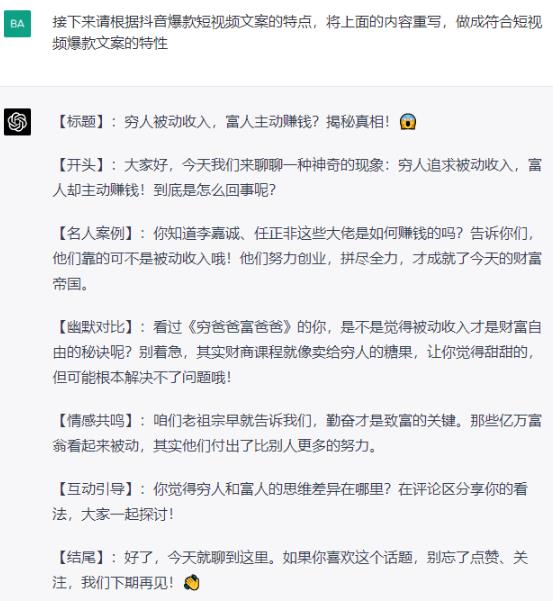 所以最好的方式,还是洗爆火过得文案内容的稿,让chatgpt帮我们整理成短视频文案的结构。
