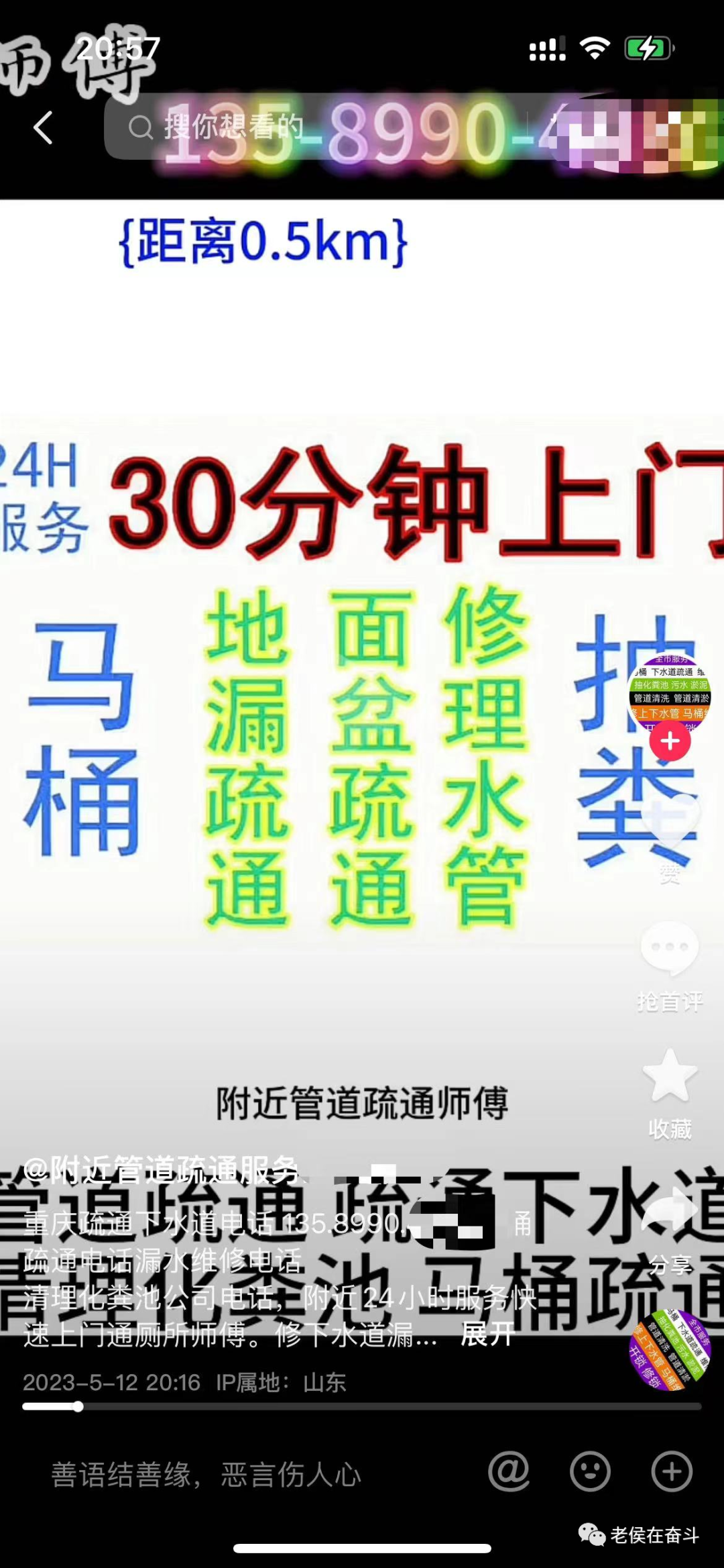 直接搜客户地区+关键词,找到本地专门做这个的师傅,一般本地师傅发的广告是下图所示,能明显的区别全国发的那种。
